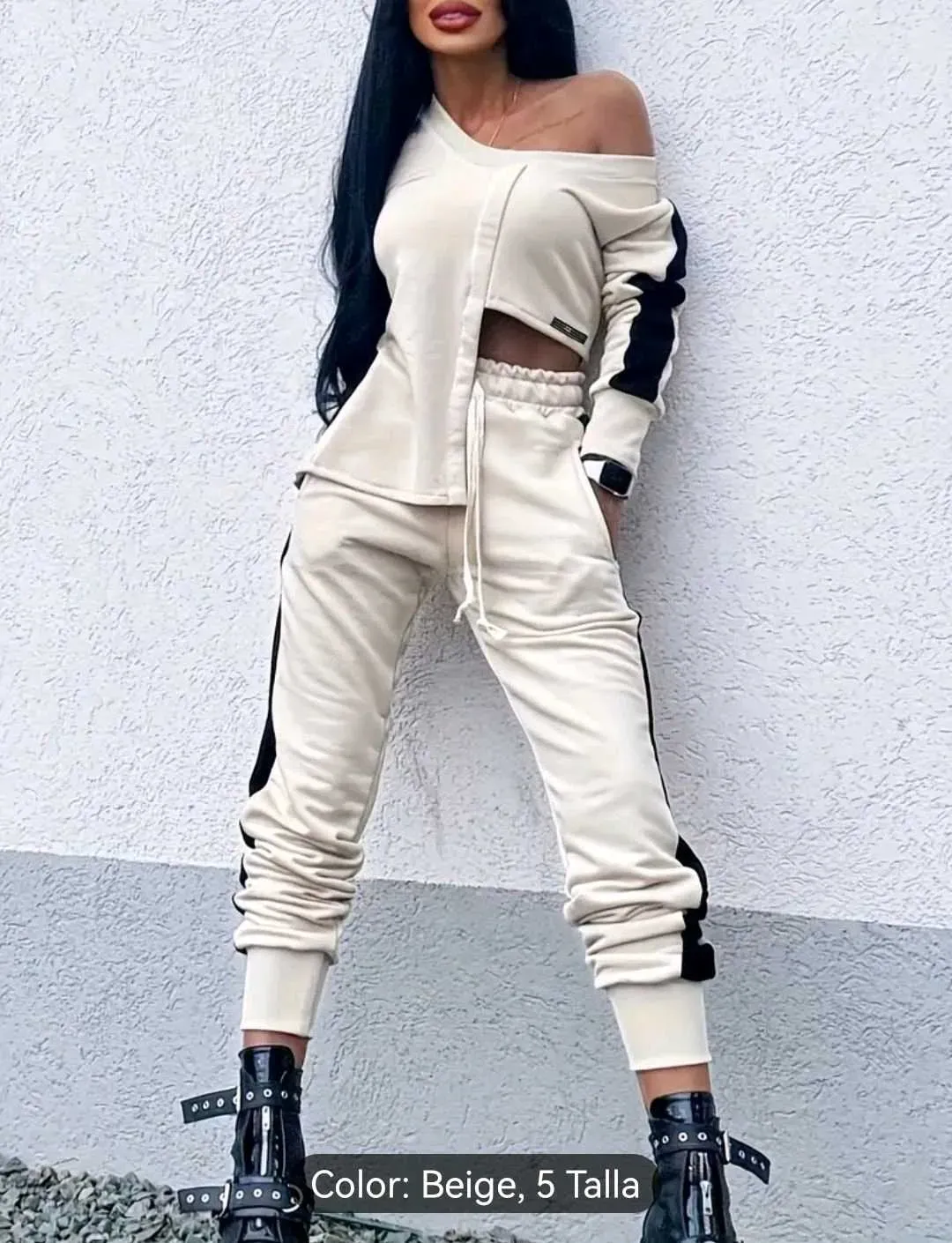 Conjunto irregular de un hombro con parches, sudadera casual de manga larga y pantalones deportivos con cordón, conjunto de top de manga larga con cuello en V y con estilos pantalones con bolsillos, ropa de mujer.